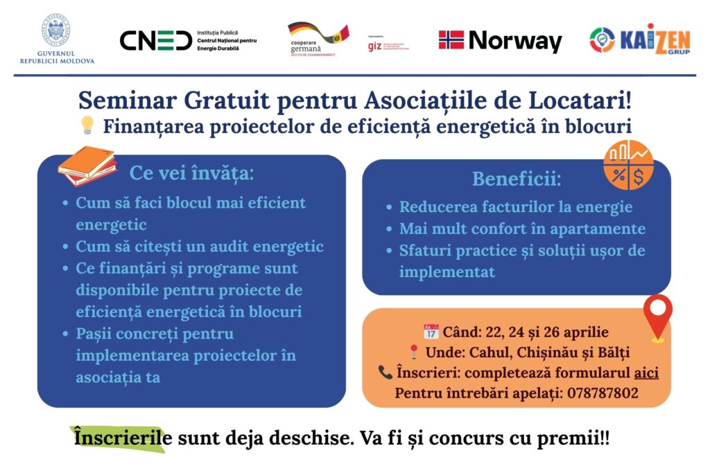 Seminar gratuit pentru Asociațiile de Locatari Finanțarea proiectelor de eficiență energetică în blocuri Linkul catre formularul de inscriere.